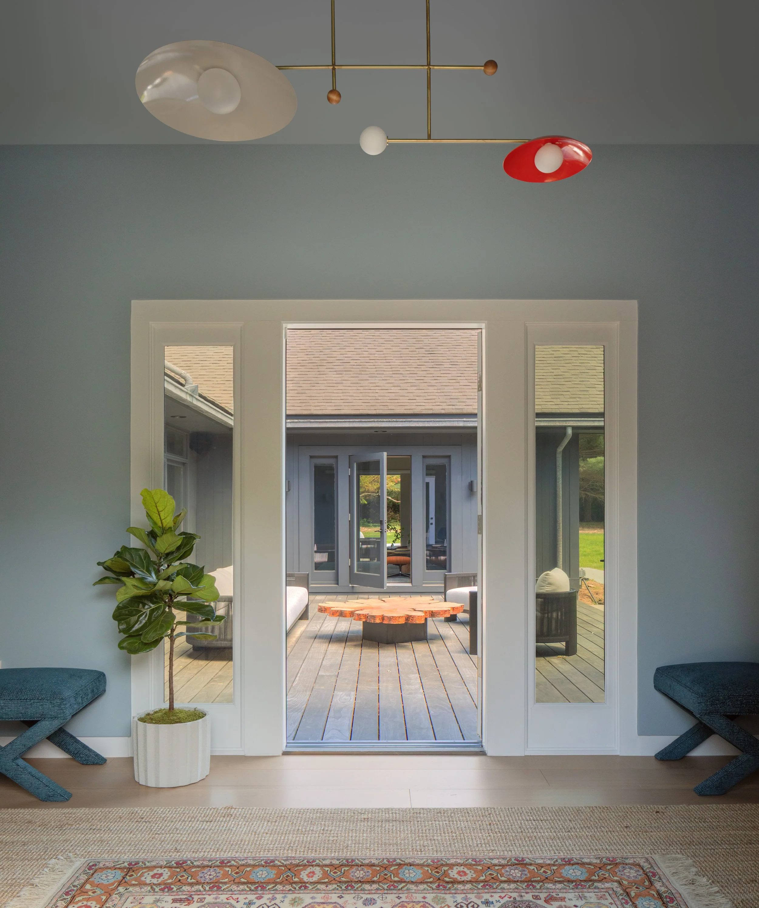 The owners of this Amagansett home have a fearless approach to color and pattern, which is reflected in the bold mix of wallpapers, rugs and upholstery. Iconic midcentury furniture imparts a sense of ease and integrates seamlessly with the architecture.